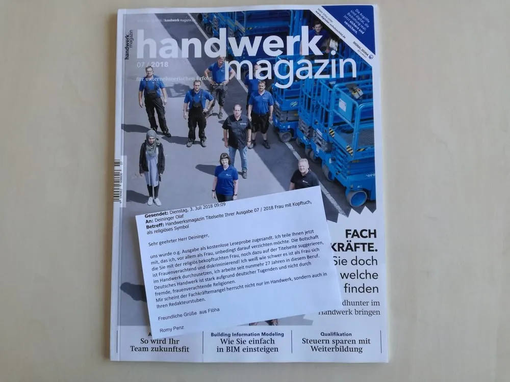 Eine Kommunalpolitikerin der AfD wirft handwerk magazin vor, das Titelbild der Juli-Ausgabe sei frauenfeindlich und frauendiskriminierend. Zuerst als Leserbrief, dann öffentlich auf Facebook. Das löste eine Debatte aus, an der sich etliche Leser und Verbände beteiligten.