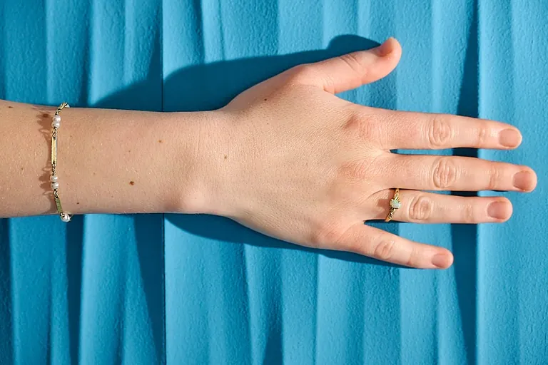 Die goldenen Ohrringe sowie die zweite Halskette stammen von der Marke Luamaya. An den beiden Kreolen baumeln außerdem verschiedene Muschelanhänger, die für Schulte ihre Liebe zum nahegelegenen Meer symbolisieren. Ein neuseeländischer Opal ziert ihren Ehering, der einst von einem traditionellen Maori-Künstler angefertigt wurde.