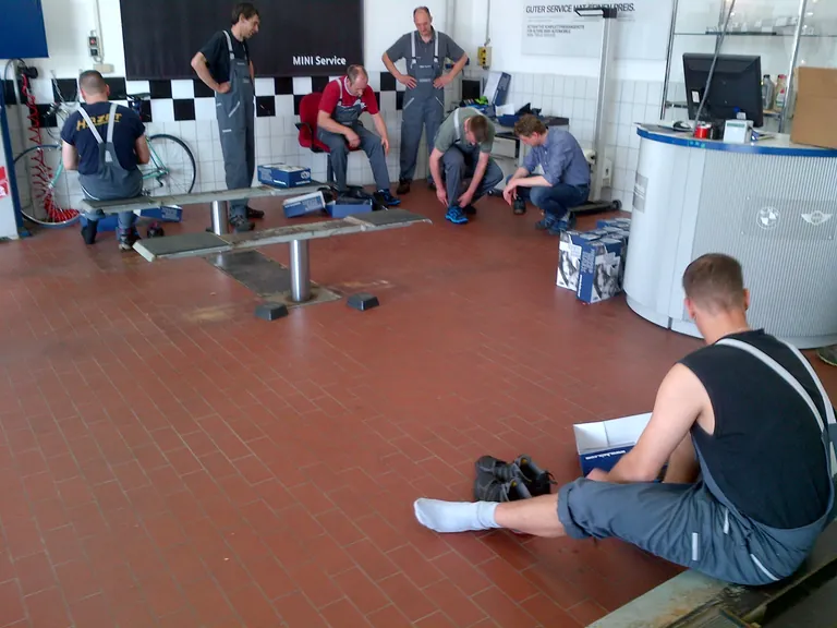 Einkleidung in der Werkstatt: Die Mitarbeiter des BMW-Autohauses Wernecke in Wildau testen vier Wochen lang den neuen S3-Sicherheitsschuh Black Eagle Safety von Haix. - © Gore