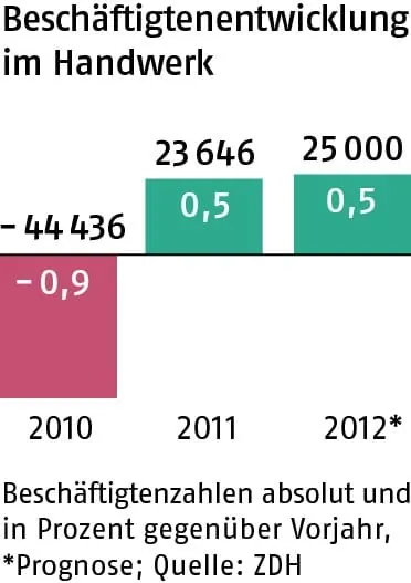 Die Auftragsauslastung liegt mit sieben Wochen weit über den Werten des Vorjahres. Auch die Umsätze im Handwerk, so schätzt der Zentralverband, werden 2012 um zweieinhalb Prozent wachsen. Zudem dürften die Beschäftigtenzahlen wie im Vorjahr um rund 25000 steigen, weil die Betriebe angesichts des Fachkräftemangels ihre Belegschaft zusammenhalten.