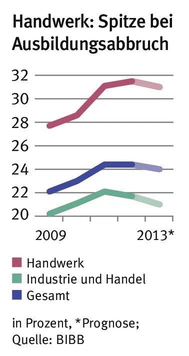 Wer mit dieser Zäsur nicht fertig wird, wirft gerade im Handwerk schnell das Handtuch. Über 31 Prozent der Azubis lösen den Ausbildungsvertrag vorzeitig auf. Jeder Dritte tut dies während der viermonatigen Probezeit – in Industrie und Handel sind es deutlich weniger. Vor allem Konflikte mit Ausbildern und anderen Mitarbeitern, Enttäuschung über die Ausbildungsinhalte und unbefriedigende Arbeitsbedingungen werden dem Bundesinstitut für berufliche Bildung (BIBB) in Bonn von den Auszubildenden als Kündigungsgründe genannt.