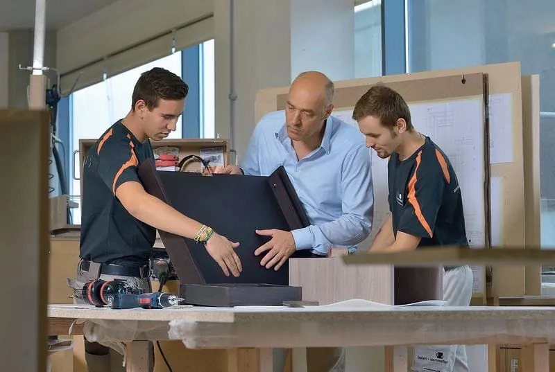 Ein großer Betrieb wie Baierl & Demmelhuber mit rund 300 Mitarbeitern hat bei der Ausgestaltung zweifellos mehr Spielraum als ein kleiner: Die Oberbayern haben eine Lehrwerkstatt, wo angehende Produktdesigner, Maler, Schreiner, Metallbauer und Trockenbaumonteure während der ersten Wochen einfache Produkt- und Montageteile anfertigen.