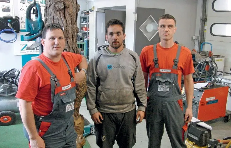 Firmenchef Heiko Seeger mit Neu-Azubi Vicente Garcia Guardiola, rechts Werkstattleiter Thomas Hauser.