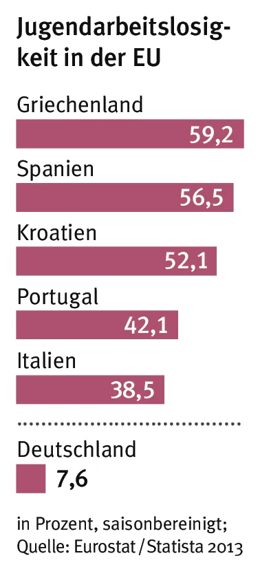 Die Angaben beziehen sich auf die Altersgruppe der unter 25-Jährigen. Im Durchschnitt liegt die Jugendarbeits­losenquote in der EU bei 23,3 Prozent.