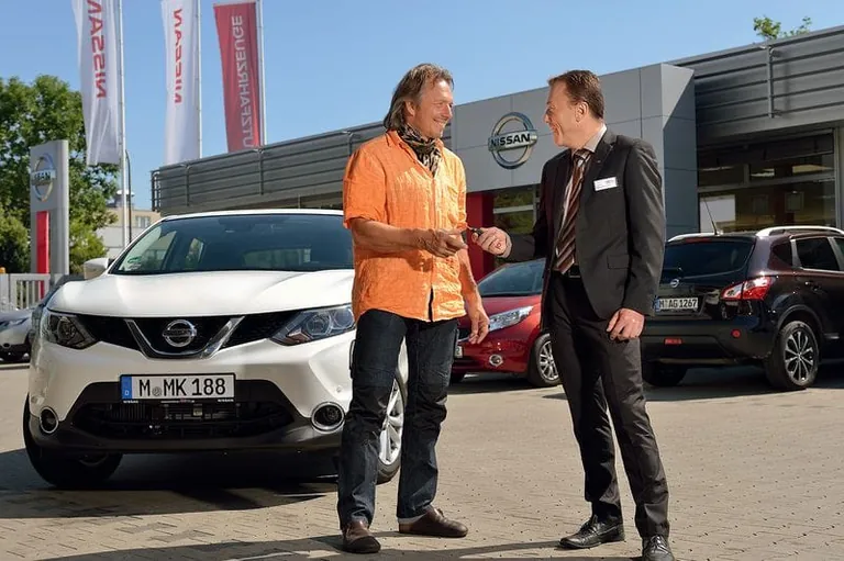 „Beim Nissan Qashqai stimmt das Preis-/ Leistungs­verhältnis.“ Christian Cornelius (li.), Gebäudereinigungsunternehmer, bekommt den Schlüssel für den Testwagen von Stefan Peroutka vom Nissan-Autohaus Mükra in München. - © Thomas Einberger