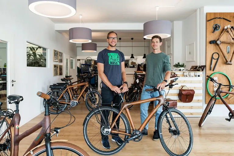 Baukastensystem für Bambusfahrräder: Geschäftsführer Jonas Stolzke (li.) und Zweiradmeister Dominik Hansen in den Geschäftsräumen von „my Boo“ in Kiel. - © Julius Demant