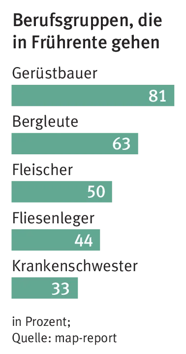 Wie wichtig dieser Risikoschutz für Handwerker ist, belegen aktuelle Auswertungen: Rund 20 Prozent aller Arbeitnehmer steigen laut Studien vorzeitig aus ihrem Beruf aus, weil Körper oder Seele nicht mehr mitmachen. Im Handwerk sind davon insbesondere Gerüstbauer, Fleischer und Fliesenleger betroffen (siehe Grafik Seite 58). Die gesetzliche Erwerbsminderungsrente greift erst spät und fällt niedrig aus. Die Gefahr, in Hartz IV abzurutschen, ist groß. Das gilt vor allem für Selbständige.