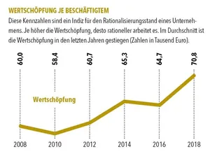 Auch die Zuwächse bei der Wertschöpfung je Beschäftigtem überzeugen. Mit fast 71.000 Euro liegt der durchschnittliche Gesamtwert so hoch wie nie in den letzten Jahren.