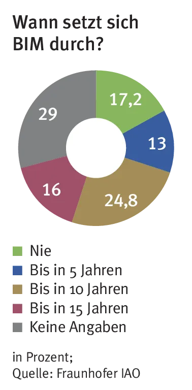 Noch ist allerdings die Zurückhaltung hierzulande groß. Das Fraunhofer Institut für Arbeitswirtschaft und Organisation hat kürzlich eine Umfrage unter Architekten, Planern und ausführenden Unternehmen durchgeführt. Danach ist die Branche noch weit von der digitalen Baustelle entfernt. Von den rund 400 Befragten können 20 Prozent mit dem Begriff „BIM“ nichts anfangen, 18 Prozent halten die Methode für ungeeignet, nur 14 Prozent arbeiten bereits damit. Und 17 Prozent sagen: BIM wird sich nie durchsetzen.