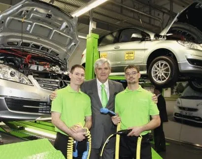 Groß eingestiegen in das Geschäft mit Elektrofahrzeugen ist die Mercedes-Benz-Niederlassung in Berlin. Der Handwerksbetrieb wurde von der Innung des Kfz-Gewerbes Berlin als bundesweit erster „Fachbetrieb für Hochvoltfahrzeuge und Brennstoffzellentechnik“ zertifiziert. Walter Müller, Direktor der Niederlassung, sagt nicht ohne Stolz: „Wir stellen uns damit an die Spitze einer Entwicklung in unserer Branche.“ 15 zusätzliche Arbeitsplätze sind entstanden, besetzt mit speziell ausgebildeten Hochvolt-Elektrofachkräften und Druckgaskesselspezialisten. Alle technischen Azubis werden ab sofort in den neuen Technologien geschult. Zahlreiche Spezialwerkzeuge mussten angeschafft werden, sogar ein antistatischer Fußboden wurde in der