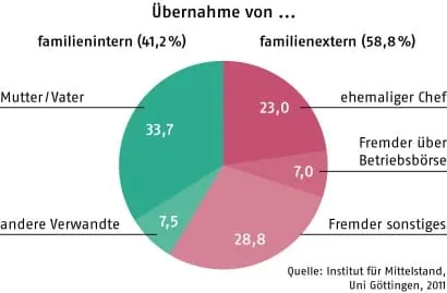War ein solcher Übergang vom Vater auf den Sohn in handwerklichen Familienbetrieben früher nahezu ungeschriebenes Gesetz, suchen inzwischen immer mehr Töchter und Söhne ihre berufliche Erfüllung außerhalb der Familiendynastie. Wie eine Studie des ifh-Göttingen aus dem Jahr 2010 zeigt, liegt der Anteil der familieninternen Nachfolger nur noch bei 41 Prozent (siehe Chart Seite 13). „Die Unternehmerkinder von heute sind gut ausgebildet, haben mehr berufliche Alternativen und lassen sich auch ihren Lebenslauf nicht mehr von den Eltern vorschreiben“, kommentierte Franz Falk, Nachfolgeexperte und Geschäftsführer der Handwerkskammer Stuttgart, den Trend.