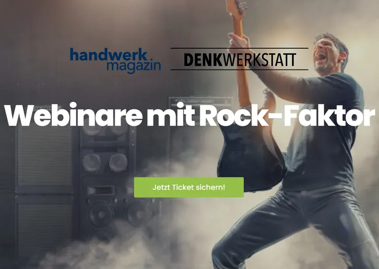 Die „Denkwerkstatt“ von handwerk magazin gibt’s jetzt auch digital! Unter dem Motto „Webinare mit Rock-Faktor“ erwarten Sie vier Live-Webinare mit vier Top-Speakern, die Ihr Handwerk verstehen. Dazu gibt’s – gemäß dem Rock-Motto – ein Warm-up mit Rockbeats und einen lockeren Austausch von Chef zu Chef.