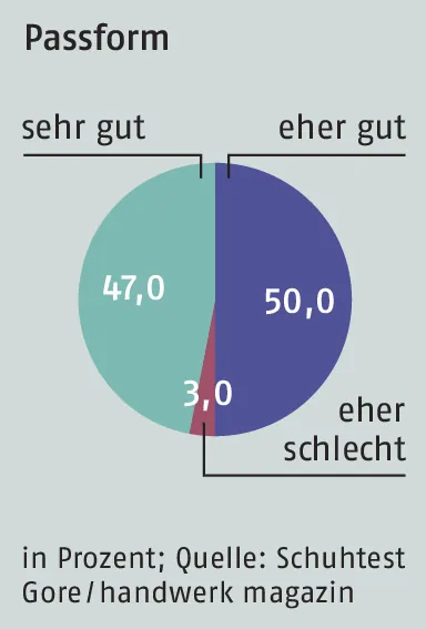 - Passform Für 97 Prozent der Tester passte der Schuh sehr gut und gut, die bei vielen Sicherheitsschuhen kritische Polsterung der Zehenkappe empfanden 29 Prozent als sehr gut gelöst, 65 Prozent bezeichneten die Polsterung als gut.