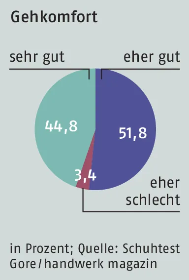 - Gehkomfort Die Frage, ob der Schuh im Alltag „leicht zu laufen“ ist, beantworteten 45 Prozent mit sehr gut und 52 Prozent mit gut (siehe Chart), lediglich ein Mitarbeiter fand den Gehkomfort eher schlecht.