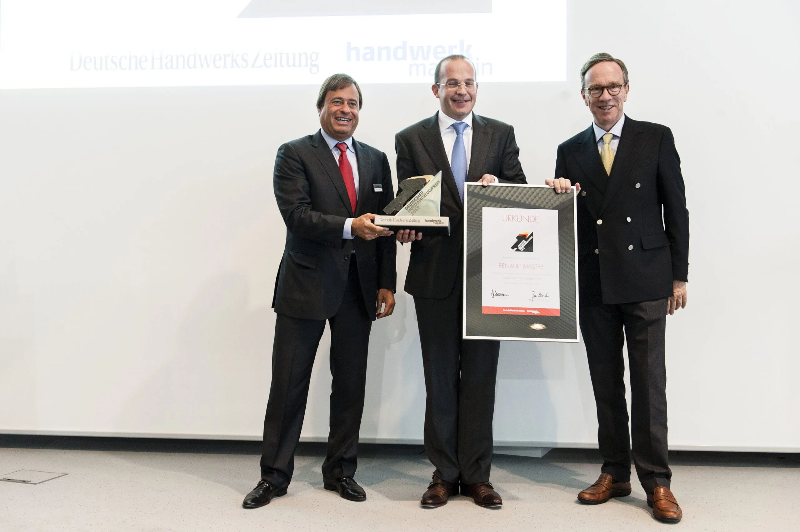Der Renault Master ist Nutzfahrzeug des Jahres. Die Preisverleihung zum Deutschen Nutzfahrzeugpreis 2012 fand auf der Internationalen Automobil-Ausstellung (IAA) Nutzfahrzeuge in Hannover statt. Matthias Wissmann, Präsident des Verbandes der Automobilindustrie (VDA) und Verleger Alexander Holzmann (Holzmann Medien, Bad Wörishofen) überreichten die Preise an die Vertreter der Automobilindustrie. Wissmann betonte in seinem Statement zur Preisverleihung die wichtige Partnerschaft von Handwerk und Industrie. Transporter seien die „Arbeitsbienen“ des Verkehrs.