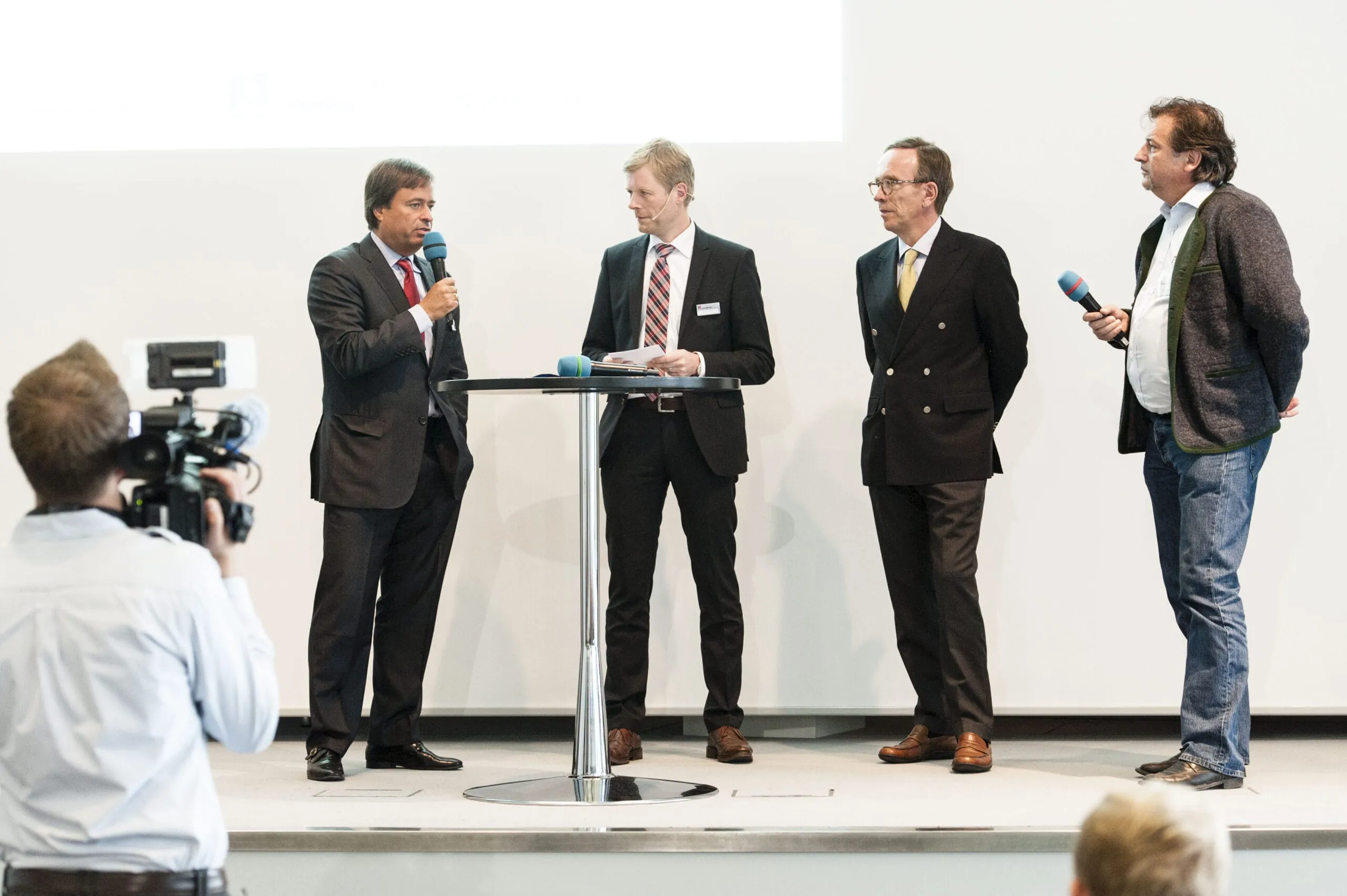 Handwerksunternehmer Uwe Heppner-Rohls (rechts) diskutierte mit mit VDA-Präsident Wissmann und Verleger Holzmann (links). Holger Externbrink (zweiter von links), Chefredakteur von handwerk magazin, moderierte die Preisverleihung.
