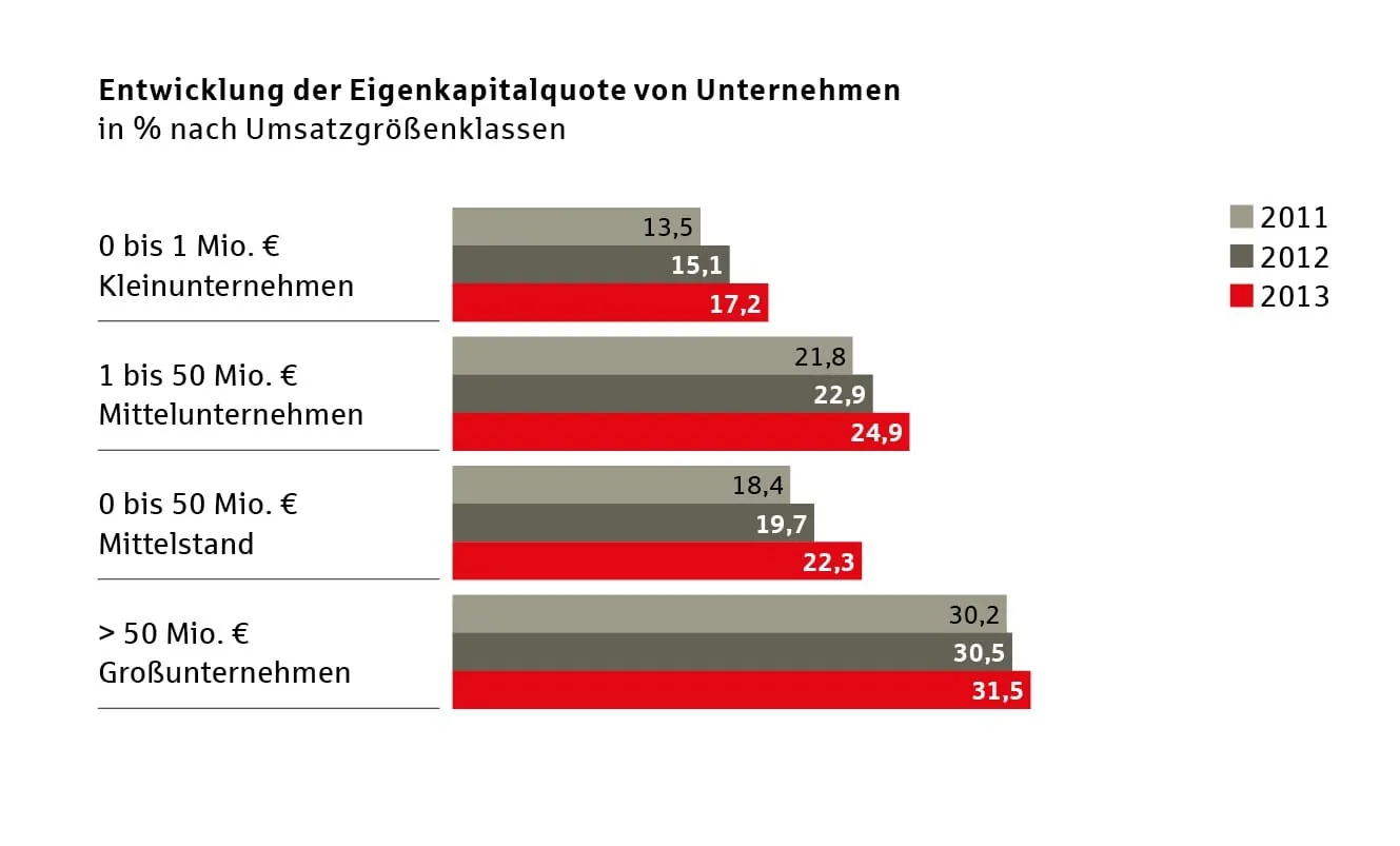 Mit einer Eigenkapitalquote von durchschnittlich 22,3 Prozent erreicht der Mittelstand einen neuen Rekordwert. Das Eigenkapital stieg bei Betrieben aller Größen. Auch Kleinunternehmen mit einem Umsatz von unter einer Million Euro verfügen mit 17,2 Prozent über ein solides Eigenkapitalpolster.