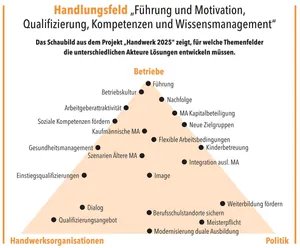 - 2. Handlungsfeld: „Führung und Motivation, Qualifizierung, Kompetenzen und Wissensmanagement“ mit den Schwerpunkten Nachwuchskräfte und Fachkräfte gewinnen und binden, Personalführung, Kompetenzen sowie Nachfolge und die Betriebsübergabe.