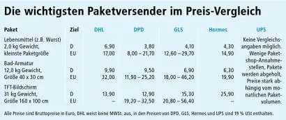 Erstes Kriterium für einen Paketdienst ist der Preis, und der ist sehr unterschiedlich. So verlangt die Deutsche-Post-Tochter DHL für EU-Länder im günstigsten Tarif für das kleinste Paket 17 Euro, Hermes dagegen nur 14,90 Euro. DHL-Pakete innerhalb Deutschlands kosten 6,90 Euro bei maximal zehn Kilo Gewicht. Doch private Logistikunternehmen versenden deutschlandweit versicherte Pakete längst zum Päckchenpreis. Für knapp 4 Euro transportieren Hermes, DPD & Co kleine und leichte Pakete quer durch die Republik.