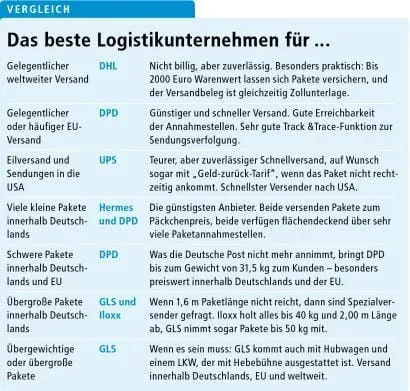Doch wer ist nun der beste Paketdienst für Handwerker? Eine eindeutige Anwort auf diese Frage gibt es nicht, deshalb ist in dem Vergleich (siehe Tabelle unten) für ganz konkrete Kundenanforderungen der jeweils beste Logistiker genannt. Bei Paketen in Nicht-EU-Länder ist es zum Beispiel trotz der hohen Preise DHL, weil die Zollformalitäten schon mit dem Ausfüllen des Paketscheins (bei Werten bis 2000 Euro) erledigt sind. Doch innerhalb der EU versenden alle privaten Anbieter billiger. -