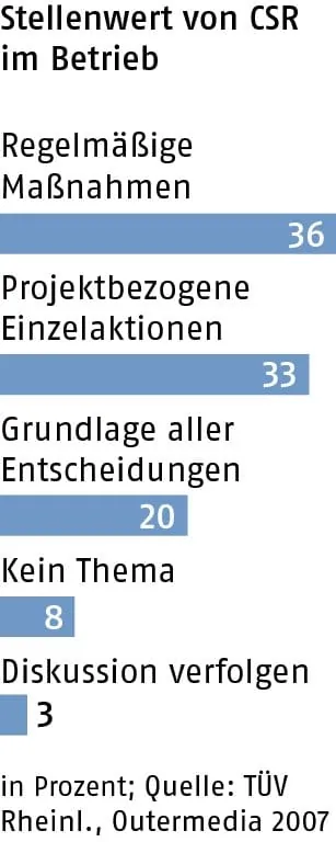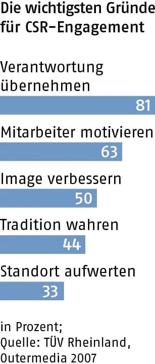 Die CSR-Diskussion werde in der öffentlichen Wahrnehmung deshalb „stark von Großunternehmen dominiert“, bestätigt Klaus Müller vom Institut für Mittelstand und Handwerk in Göttingen. Seine Empfehlung lautet deshalb: „Verankern Sie CSR als festen Bestandteil in Ihrer Firmen- und Marketingstrategie. Gehen Sie planmäßig vor. Machen Sie Ihre Aktivitäten publik.“