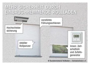 Manchmal hilft schon die Nachrüstung der Rollläden mit Motor und automatischer Steuerung. Zeitschaltuhren simulieren dann Anwesenheit und schrecken Einbrecher dadurch ab. Welche Maßnahmen zum Einbruchschutz im Einzelfall sinnvoll sind, wissen die Fachbetriebe des Rollladen- und Sonnenschutztechniker-Handwerks.