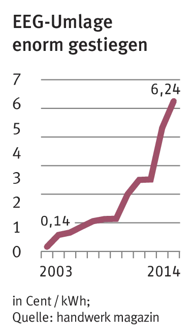 Neben den Handwerkern, die viel Energie benötigen, sind auch die Betriebe betroffen, die Anlagen für erneuerbare Energien anbieten. Im Elektrohandwerk gibt es bereits erste Warnzeichen. So hat die Firma Reisinger Sonnenstrom in Egenhofen bei München im ersten Quartal 2014 rund 40 Prozent weniger Solaranlagen als im Vorjahreszeitraum montiert. „Seit der EEG-Reform 2012 geht wegen höherer Auflagen für Fotovoltaikenergie die Nachfrage zurück“, berichtet Inhaber Bernd Reisinger. „Ich musste mich deshalb von fünf Mitarbeitern trennen.“