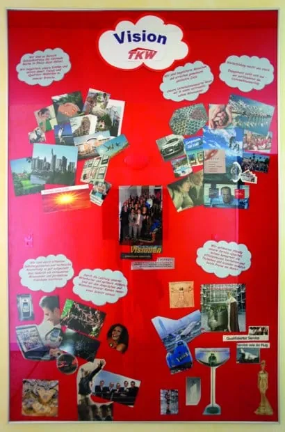 Um Effizienz geht es auch in der großen Visions-Fotocollage, einem Lieblingsplatz des Chefs im Gang neben dem Empfang. Die Bilder visualisieren, wofür der Betrieb steht. „Sie stellen sicher, dass jeder unter den Worten dasselbe versteht“, sagt Kienzl. Die Collage zeigt etwa Ameisen, die in ihrem Staat effizient zusammenarbeiten. Sie zeigt einen Tower der Frankfurter Skyline - die Klientel von Kunden, die TKW ansprechen will. Oder Medaillen, die das Ziel meinen, ausgezeichnet zu werden. Nur ein paar Schritte neben der Collage, in einer Vitrine, steht seit November die Statue vom Ludwig-Erhard-Preis.