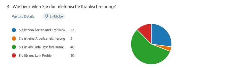 Auch die telefonische Krankschreibung aufgrund erkrankter Kinder findet in der Umfrage nur wenige Anhänger: Zehn Teilnehmer begrüßen sie, 29 lehnen sie ab, aber immerhin 42 Befragte stehen ihr neutral gegenüber – was wohl auch daran liegt, dass sie kaum genutzt wird.
