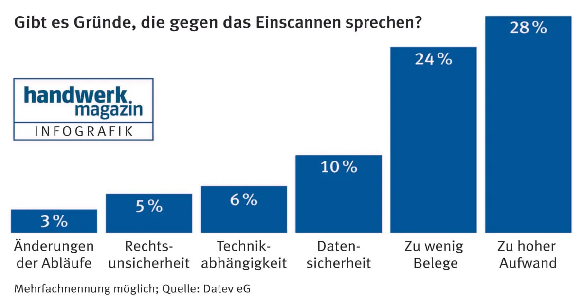 Handwerksunternehmer brauchen keine Aktenberge mehr im Keller anzuhäufen. Das Finanzamt akzeptiert es, wenn Belege einfach eingescannt und danach weggeworfen werden. Der Haken dabei: Die große Mehrheit der Mittelstandsunternehmer konnte bei einer Umfrage der Datev und handwerk magazin mit dem Begriff des sogenannten „Ersetzenden Scannens“ nichts anfangen. Erst 35 Prozent der Firmenchefs mit zwei bis zehn Beschäftigten haben davon gehört. Nur 11 Prozent wenden das Verfahren bisher an. 28 Prozent lehnen die Digitalisierung ab, weil sie einen zu hohen Aufwand für sich befürchten (siehe „Gibt es Gründe, die gegen das Einscannen sprechen?“). Dabei können Handwerksunternehmer mit dem sogenannten ersetzenden Scannen Geld und Zeit sparen.