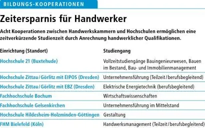 Von der Qualität der Meister und ihrer Studierfähigkeit ist Friedrich Hubert Esser, Leiter der Abteilung Berufliche Bildung des Zentralverbands des Deutschen Handwerks, indes sehr wohl überzeugt. Er befürwortet, dass Meistern bereits erbrachte Leistungen für die Studienzeit sogar gutgeschrieben werden, wie es an einigen Hochschulen, die mit Handwerkskammern kooperieren bereits geschehe (siehe Tabelle Seite 34). „Unrealistisch“, meint Meister Thiele und empfiehlt jedem, der ein technisches Studium anvisiert, vorher das Fachabitur abzulegen. Ob Meister oder Geselle: „Die werden wie alle anderen auch ins kalte Wasser geworfen.“