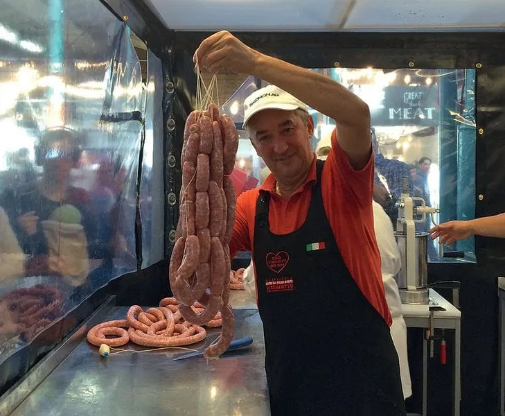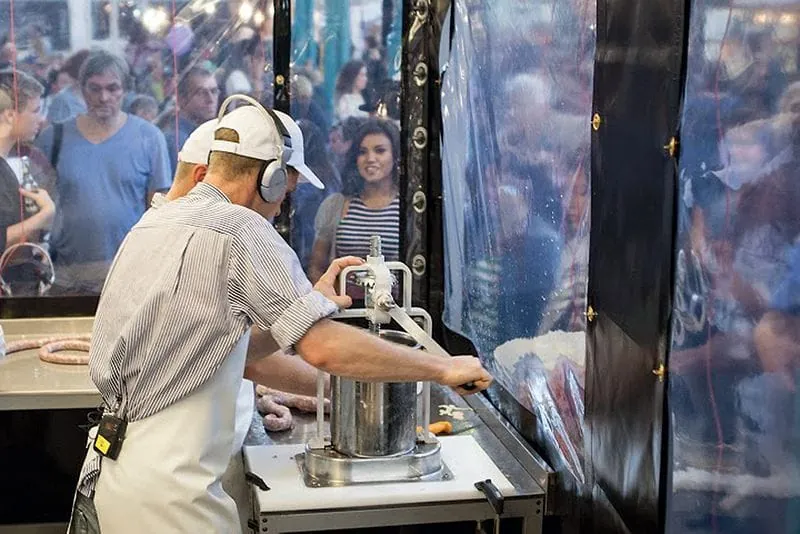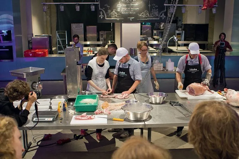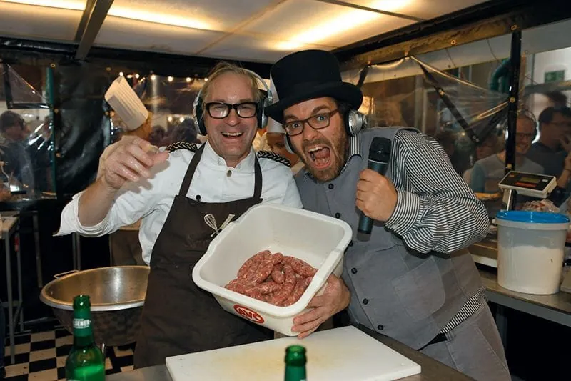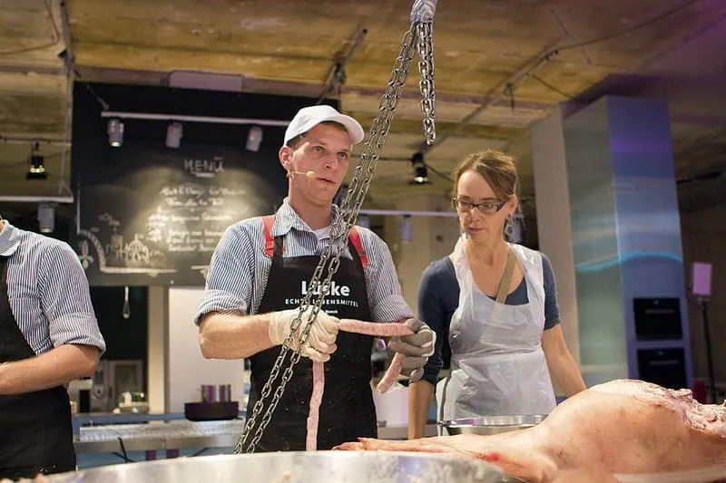 Im Oktober trifft Moderator Haase die Kitchen Guerilla und Peter Inhoven in Sachen Wurst wieder. Dieses Mal auf dem Berliner „Stadt Land Food“-Festival in der Markthalle Neun. Knapp 100 000 Menschen besuchen das in Kooperation mit Slow Food und dem alternativen Agrar-Bündnis „Meine Landwirtschaft“ organisierte Festival an vier Tagen und passieren am Wochenende auch die „Werkstatt Wurst“. Im Zweistundentakt bekommen Bratwurst-Kreateure wie Inhoven hier eine Bühne oder, besser gesagt, eine Art „gläserne Manufaktur“ und zerlegen, schnippeln, würzen, füllen – alles per Hand. 5000 Würste werden so in zwei Tagen hergestellt und gleich nebenan gegrillt, auch türkische Sucuk und italienische Salsiccia. Nordfranzösische Schweinebratwurst stellt der Berliner Fleischermeister Jörg Förstera von den Wurstkomponisten vor: Saucisse de Toulouse mit geräucherter Paprika, Weißwein, Sahne und frisch geriebener Muskatnuss. Über ein Headset ist er akustisch mit seinem Publikum verbunden. Hinter der transparenten Wand sind alle rund 60 Kopfhörer vergeben, die Zuschauer verfolgen jeden seiner Arbeitsschritte, lauschen, woher das Fleisch kommt, verstehen, dass gute Produkte ihre Zeit brauchen. Sie gehen rüber zum Grill und lecken sich nach der Saucisse die Finger. Nächster Programmpunkt: Schafskäse-Bärlauch-Bratwurst von der Küste, gefertigt von den jungen Metzgermeistern vom LandWert Hof in Stahlbrode.