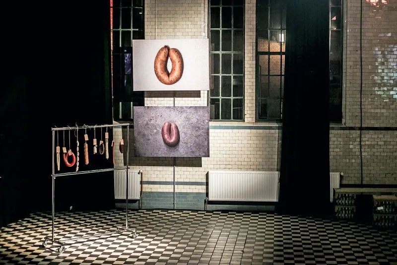 Diskutierend steht Hendrik Haase mit zwei Gästen an einem Kleiderständer, von dem dünne und dicke, weiße und schwarze Würste an Fäden herunterbaumeln. Eine Hand am Bier, die andere greift zum handbeschriebenen Schild mit Informationen zur jeweiligen Wurst. Echtes Interesse, wertschätzendes Staunen. Zusammen mit rund 130 Leuten erleben sie die erste Wurstgalerie in der Berliner Malzfabrik. Hier darf die ausgestellte (Handwerks-)Kunst nicht nur betrachtet, sondern auch gleich probiert werden. Mit einem Messer, direkt vom Kleiderständer weg oder an einer der beiden Tafeln sitzend, an deren Kopfende Peter Inhoven sein Equipment aufgebaut hat. Der Metzgermeister ist aus Düsseldorf angereist. Wurst-Papst, Fleischstylist, Kult-Metzger nennen sie ihn dort. Mit seiner über 80 Jahre alten Füllmaschine produziert er live die Bratwürste, die kurze Zeit später – bei lautem Sound des DJs – fein angerichtet verzehrt werden.