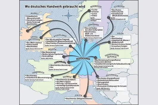 Europas Märkte beim Handwerk begehrt: Laut Umfrage bei den Außenwirtschaftsberatern der Kammern ­konzentriert sich das Auslandsinteresse der deutschen Handwerker auf Märkte in Europa, ganz vorne in der Statistik stehen die Schweiz, Luxemburg, Österreich und Frankreich.