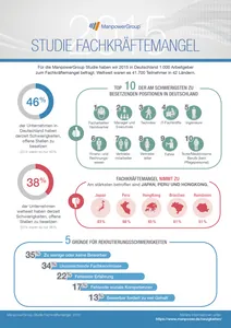 Eine von zehn Firmen spürt den Fachkräftemangel in diesem Jahr bereits deutlich stärker als noch vor zwölf Monaten. „Der Arbeitsmarkt hält mit dem wirtschaftlichen Aufschwung im Land nicht mehr Schritt", sagt Herwarth Brune, Vorsitzender der Geschäftsführung der ManpowerGroup Deutschland. Um künftiges Wirtschaftswachstum nicht zu gefährden, brauche es neue Ideen, um Menschen in Arbeit zu bringen. Das Einstellen von Flüchtlingen sollte beispielsweise erleichtert werden.
