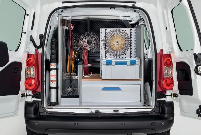 Rußfreier Schornsteinfeger Der Citroën Berlingo Electric mit Schornsteinfeger-Kompletteinrichtung von Sortimo ist lautlos, schadstofffrei und damit umweltfreundlich unterwegs. Die Reichweite des rein elektrisch angetriebenen Branchenmodells mit 49 kW (67 PS) beträgt bis zu 170 Kilometer. Das reicht, um innerhalb des Bezirkes stets mobil zu sein.