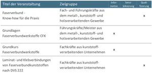Zum Zeitpunkt der Recherche (08/2018) gab es insgesamt vier Veranstaltungen, angeboten von zwei Handwerkskammern. Diese Angebote lassen sich je zur Hälfte in Qualifizierungs- und Informationsveranstaltungen einordnen. Neben den Veranstaltungen an den Handwerkskammern gibt es im Bereich der Berufsausbildung z.B. VerfahrensmechanikerIn für Kunststoff- und Kautschuktechnik mit der Fachrichtung Faserverbundtechnologie. Weiterhin gibt es zahlreiche Studiengänge mit dem Themeninhalt Faserverbundwerkstoffe wie z.B. WirtschaftsingenieurIn – Wahlschwerpunkt Faserverbundtechnologie, Verbundwerkstoffe/Composites, Leichtbau oder Anwendungstechniker für Leichtbau.