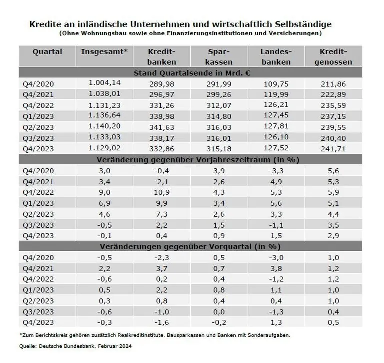 Die Banken verschärfen ihre Kreditbedingungen – und die Betriebe fragen weniger Kredite nach. Die Folge: Der Bankenverband erwartet eine gesamtwirtschaftliche Stagnation für 2024. Denn es gibt auch positive Signale: der robuste Arbeitsmarkt und der perspektivisch anziehende private Konsum. Auch die sinkende Inflationsrate von derzeit 2,9 Prozent auf prognostizierte 2,5 Prozent bis Ende des Jahres sollte den Betrieben helfen. Ein Ausblick auf die Finanzierungssituation der Betriebe.