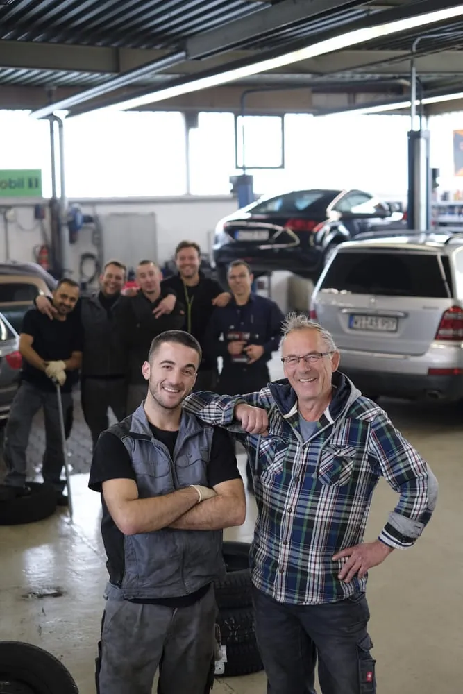 Wolfgang Spalding (vorne rechts), einer der Geschäftsführer der Kfz-Werkstatt Kolbenfresser in Wiesbaden, mit dem Kosovo-Albaner Amir Kamerolli. »Man darf nur keine Vorurteile haben, dann kann man die Potenziale der Menschen auch erkennen.«