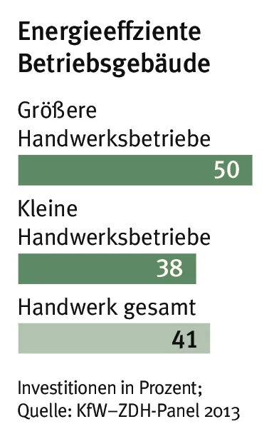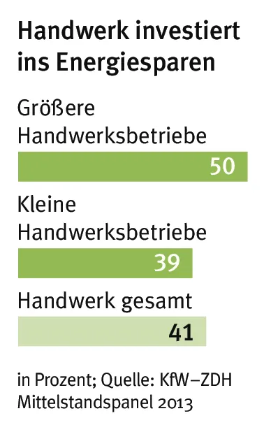 Wie der Friseurmeister agieren derzeit zahlreiche Unternehmer. Handwerkschefs zeigen eine überdurchschnittliche Bereitschaft, in Maßnahmen zur Energieeffizienz der Betriebe zu investieren. Nach den aktuellen Ergebnissen des KfW-ZDH-Mittelstandspanels wollen 41 Prozent der Handwerker dafür Geld ausgeben. Im Mittelstand insgesamt nur 36 Prozent (Details siehe Grafik rechts).