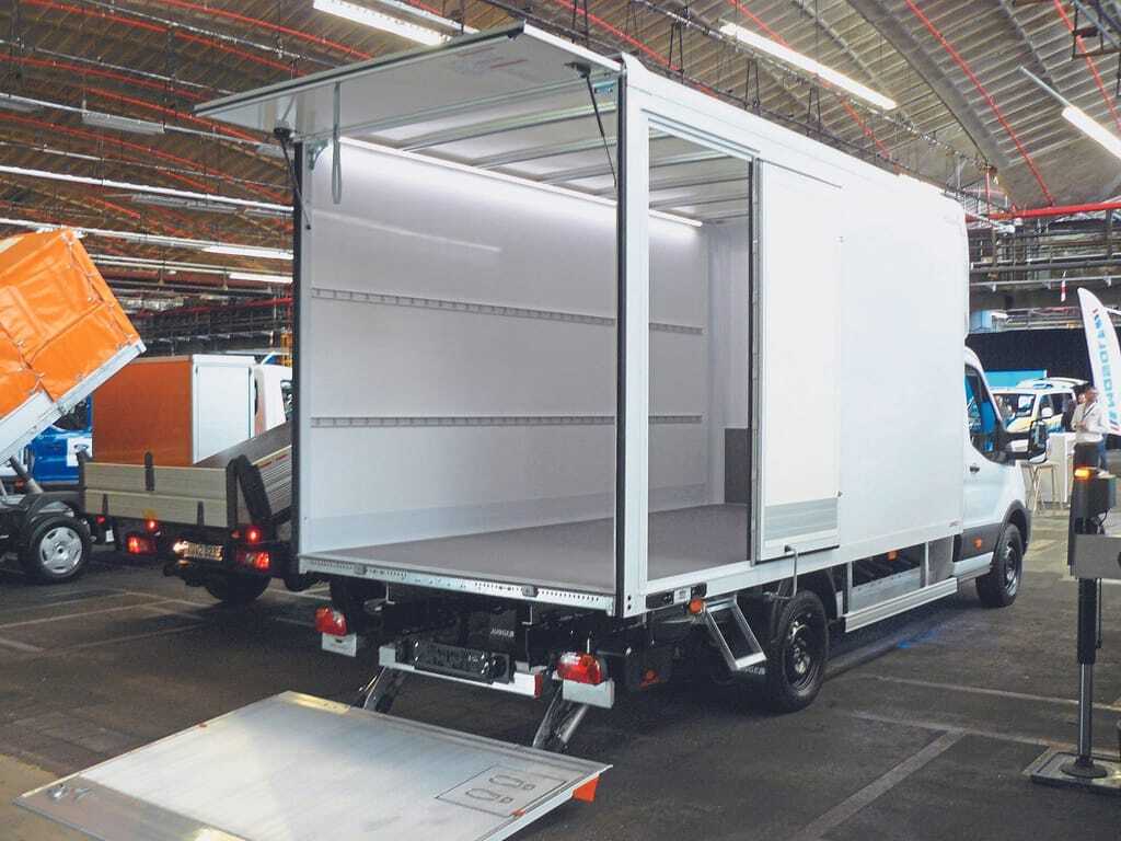 Junge als Spezialist für Kofferaufbauten steuert das zweite Einrechnungsfahrzeug bei: einen Koffer mit den Maßen 4,4 x 2,15 x 2,25 Meter (Länge x Breite x Höhe). Florian Martin, Leiter Key Account Management, erklärt die Besonderheiten: Die sogenannte Ecobox spart mit abgerundeten Kanten und Dachspoiler Sprit oder Strom. Wabenpaneele senken das Gewicht. Zur Wahl stehen Varianten mit Hecktüren, Ladebordwand sowie Seitentür. Wer zum gewichtigen E-Transit greift, kann bei der Variante mit Ladebordwand bei einer zulässigen Gesamtmasse von 4.075 Tonnen 1.075 Kilogramm schleppen. Mit Hecktür sogar rund 150 Kilo mehr.