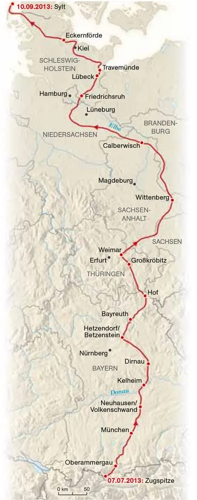 Acht Bundesländer bereiste Fotograf Florian Wagner mit seinen fünf Begleitern während ihrer Tour: Los ging es am 7. Juli 2013 am Fuße des mit 2.962 Metern höchsten Berges Deutschlands, der Zugspitze in Bayern. Die Route führte die Gruppe weiter über Thüringen, Sachsen, Sachsen-Anhalt und Brandenburg sowie Niedersachsen und Hamburg. Das Ziel der Tour, die nördlichste deutsche Insel Sylt im Bundesland Schleswig-Holstein, erreichte die Reisegruppe am 10. September 2013 – nach mehr als zwei Monaten.