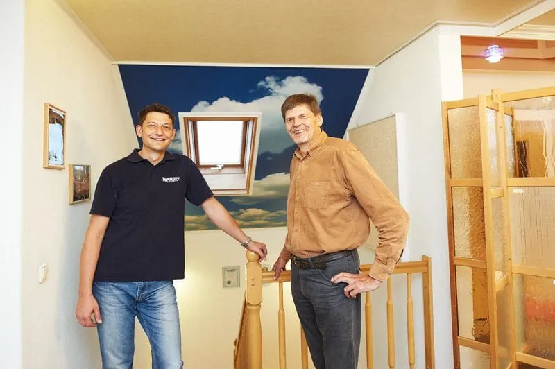 Direkt nach der Wende 1991 wurde Tischlermeister Jürgen Köpping Franchise-Partner von Plameco. „Wir starteten 1989 in einer Garage und suchten dann eine Ergänzung für die Tischlerei“, sagt er. Seit 2004 arbeiten sein Sohn Björn und seine Schwiegertochter mit in seinem 14-Mann-Betrieb. „Björn ist Verkäufer aus Leidenschaft, er holt die Arbeit ran“, sagt der 62-Jährige anerkennend. Seit sich sein Sohn hauptsächlich um neue Aufträge für Plameco bei Privatkunden kümmert, läuft das Geschäft rund um die Spanndecken hervorragend. Daraus ergeben sich auch immer wieder Aufträge für die Tischlerei. Auch wenn Plameco und die Tischlerei Köpping nicht getrennt firmieren, rein rechnerisch wissen Vater und Sohn genau, dass die Plameco-Spanndecken inzwischen 75 Prozent des Umsatzes ausmachen.