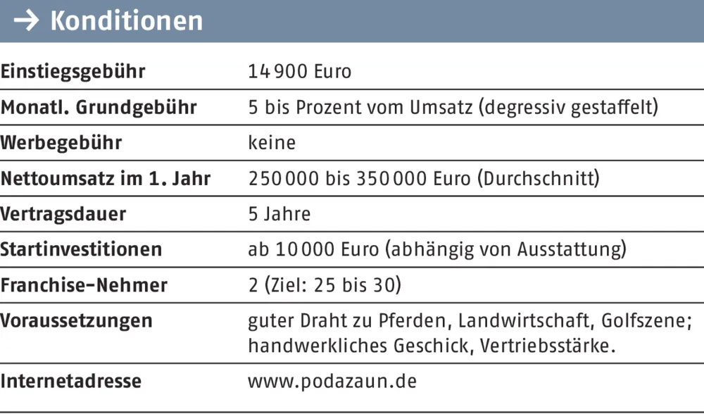 1975 in Dänemark gegründet, kommt Poda Zaun 2007 nach Deutschland. Neben dem deutschen Pilotbetrieb, der gleichzeitig die deutsche Franchise-Zentrale ist, gibt es derzeit zwei Franchise-Nehmer. Das Angebot umfasst Zäune beziehungsweise Wildgehege aus Holz, Metall und Kunststoff sowie dazugehörige Tore inklusive Wartung und Reparatur. Es richtet sich an eine zahlungskräftige Kundschaft aus dem Umfeld Golf- und Pferdesport sowie Naturschutz. Als Franchise-Partner eigenen sich laut Poda Zaun echte Newcomer, die die Montage in der Zentrale lernen, sowie Garten- und Landschaftsbauer, die sich damit ein zweites Standbein aufbauen.