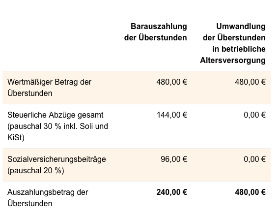 Grund genug für das Handwerk dieses Thema aufzuarbeiten. So werden in den unterschiedlichen Tarifverträgen nicht nur die Möglichkeiten für Arbeitnehmer festgeschrieben, sondern auch Arbeitgebern Sonderkonditionen gewährt. Dazu zählen neben dem verpflichtenden, monatlichen Beitrag zur betrieblichen Altersvorsorge auch die Möglichkeit, Überstunden umzuwandeln. Die nachstehende Beispielrechnung zeigt den massiven Effekt, der so für Mitarbeiter entstehen kann: