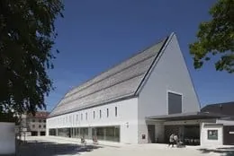 In der Laudatio der Jury heißt es: „Der Werkstoff Holz steigert den klaren Ausdruck des Steildaches durch die Verwendung von Holzschindeln und schafft einen erhabenen, großzügigen Saal, der in seiner Ästhetik von dem überzeugenden Holztragwerk geprägt wird.“