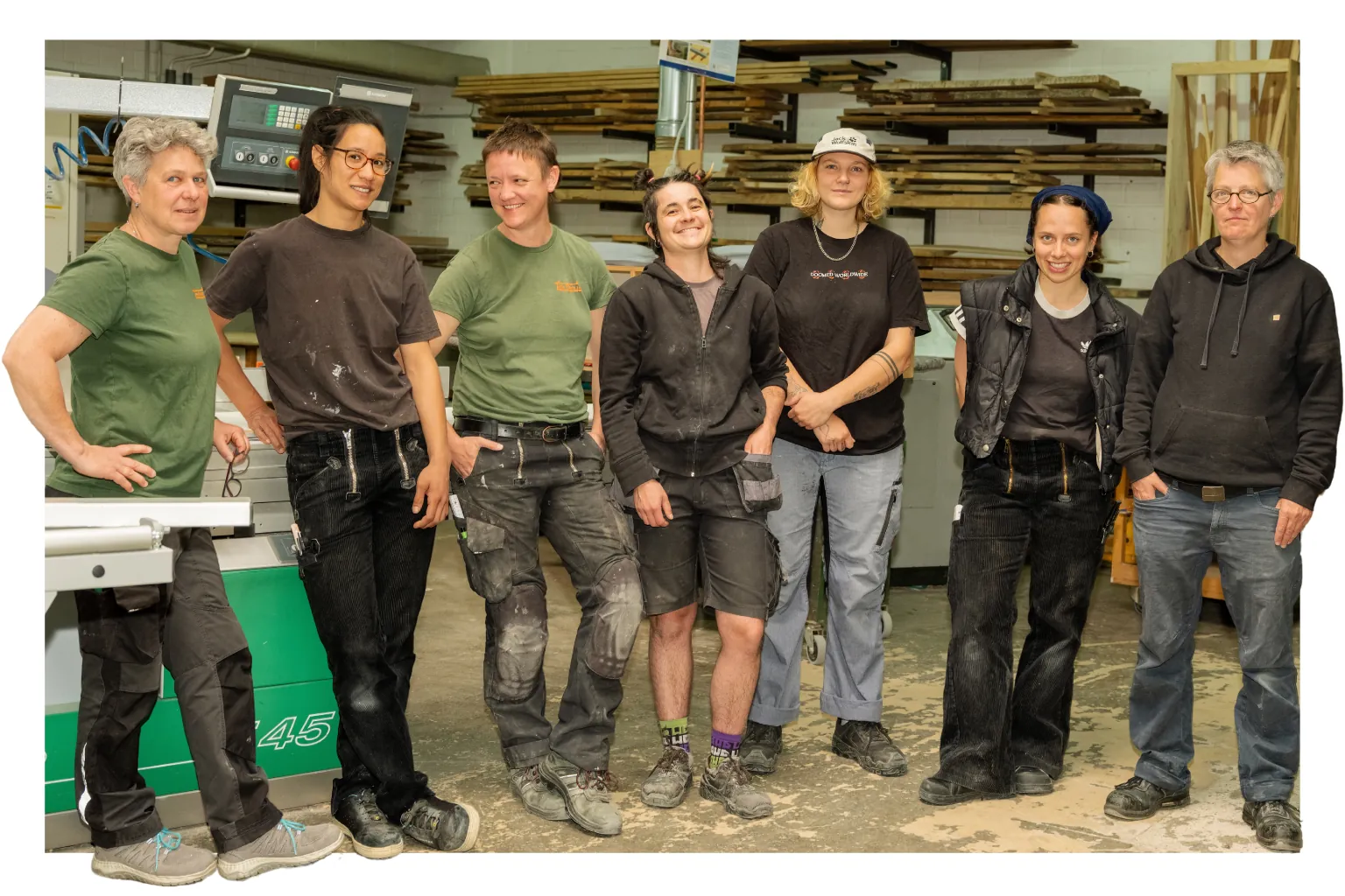 Die Tischleria setzt bewusst auf klare Strukturen. Das Team ist überschaubar – sieben bis acht Personen ist die Wunschgröße. „So bleibt die Kommunikation direkt, und wir wissen, was im Betrieb passiert.“ Neben einer familiären Betriebsgröße versuchen die Gründerinnen auch, Mitarbeiterinnen entgegenzukommen – zum Beispiel mit dem Angebot einer Vier-Tage-Woche für Gesellinnen. Gefertigt wird vieles auf Maß: Küchen, Einbaumöbel, Fenster und Türen. Besonders im Fokus: langlebige, ökologisch gedachte Möbel, die auch reparierbar bleiben.