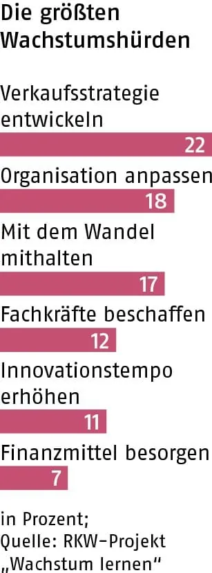 Eine komplexe Herausforderung, die wachstumswillige Betriebe in der Praxis oft überfordert. Bei dem vom Bundesministerium für Bildung und Forschung geförderten Projekt „Wachstum lernen - lernend wachsen“, haben Experten der Hochschule Rhein-Main und des Rationalisierungskuratoriums der Wirtschaft (RKW) deshalb je zwölf wachstumsorientierte Unternehmen ein knappes Jahr begleitet und beraten. Wie eine Befragung zu Projektbeginn zeigte, liegen die größten Hürden nicht etwa bei der Finanzierung, sondern im strategisch-organisatorischen Bereich (siehe Grafik). „Die Geldbeschaffung stellte nur für sieben Prozent eine echte Herausforderung dar“, staunte selbst Experte Hardwig.