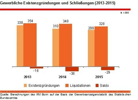 „Ein Lichtblick am Horizont ist, dass die Zahl der Betriebsgründungen von Hauptniederlassungen in 2015 entgegen dem allgemeinen Trend geringfügig stieg", erklärte Rosemarie Kay, stellvertretende Geschäftsführerin des IfM Bonn. „Diese Gründungen besitzen eine größere wirtschaftliche Bedeutung als beispielsweise Gründungen im Kleingewerbe, weil mit ihnen zumeist die Schaffung von Arbeitsplätzen einhergeht." Die Anzahl der Kleingewerbegründungen war im vergangenen Jahr um 5,8 Prozent gesunken, die der Nebenerwerbsgründungen um 1 Prozent.