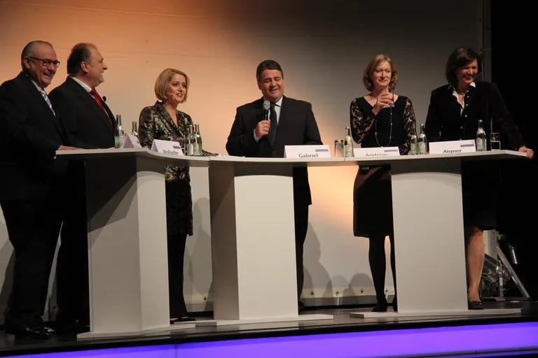 Mindestlohn, Erbschaftssteuer, Nachwuchssorgen waren die bestimmenden Themen bei einer Podiumsdiskussion mit Bundeswirtschaftsminister Sigmar Gabriel, Bayerns Staatsministerin für Wirtschaft und Medien, Energie und Technologie Ilse Aigner, der Grünen-Politikerin Kerstin Andeae, ZDH-Präsident Hans Peter Wollseifer und Friedhelm Hinsenhofen, Geschäftsleitung der LR Gebäudesanierung GmbH.